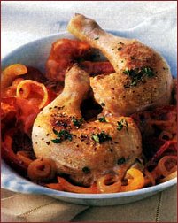 Ingrediente (pentru 4 persoane): 4 cepe (200 g), 2 ardei grasi galbeni, 2 ardei grasi rosii, 60 g sunca afumata (bacon), 4 pulpe de pui (a 200 g), sare, piper, 1/2 lingurita cimbru uscat, 250 g pasta de tomate. Mod de preparare: Se curata ceapa si se taie rondele. Ardeii, curatati de nervuri si seminte, se taie marunt, iar baconul se taie fasii. Se spala pulpele de pui, se zvanta si se freaca cu sare, piper si cimbru. Se pun fasiile de bacon intr-o cratita si se prajesc pana ce devin crocante. Se scot si in grasimea lasata se prajesc putin pulpele de pui. Apoi, se introduc ceapa si ardeii care se dunstuiesc si ele circa 5 minute. Se adauga pasta de tomate, se condimenteaza, se pun si pulpele de pui, se acopera vasul cu un capac si se lasa sa fiarba incet, cam 40 de minute. Se incorporeaza si fasiile de bacon si se baga 5 minute la cuptor - sub grill - ca sa se rumeneasca frumos carnea.