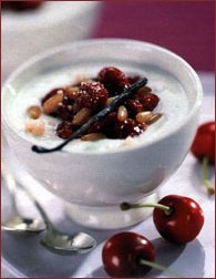 Ingrediente (pentru 4 persoane): 500 g cirese, 400 g branza grasa de vaci, 100 ml frisca lichida, 150 g zahar tos, 2 plicuri de zahar vanilat + 1 lingura de supa cu zahar, 1/2 portocala, 1 baton de vanilie. Mod de preparare: - Puneti ciresele fara samburi intr-o cratita impreuna cu zaharul, sucul stors al jumatatii de portocala si batonul de vanilie taiat in doua pe lung si apoi fiecare parte in jumatate. - Lasati sa fiarba totul pe foc mic, 30 de minute. - Bateti frisca (sa fie rece) si adaugati zaharul. Incorporati-o in branza de vaci, bine frecata inainte. Impartiti-o in patru cupe sau castronase si turnati deasupra fiertura de cirese calduta.