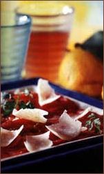 Ingrediente (pentru 4 persoane): 400 g muschi de vita, 120 g cascaval proaspat, 1 lamaie, 150 ml ulei de masline aromat, 6 fire de patrunjel verde sau de busuioc, sare, piper macinat. Mod de preparare: 747d36h Se inveleste carnea cruda intr-o folie de plastic si se tine doua ore la congelator, ca sa se intareasca. Apoi se scoate, se taie felii foarte subtiri (transparente) si se asaza pe patru farfurii. Se stoarce lamaia, se picura sucul peste feliile de carne, pe urma se toarna peste ele si cate putin ulei de masline, se invelesc farfuriile cu folii de plastic si se mai tin vreo zece minute la rece. Inainte de a servi carpaccio-ul, pe fiecare farfurie se presara "aschiile" de cascaval (taiate cu un cutit foarte ascutit), patrunjelul sau busuiocul tocat, sare si piper. Atentie! Uleiul aromat se poate prepara si in casa, in felul urmator: puneti uleiul intr-o sticla mai mica, adaugati cateva crengute de cimbru, cativa catei de usturoi zdrobiti sau frunzulite de busuioc si lasati sa se "marineze" circa o saptamana la loc ferit de lumina. Uleiul astfel "parfumat" se poate folosi si la salate, peste etc.