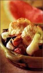 Ingrediente (pentru 4 persoane): 3 morcovi, 1 vanata, 1 radacina de fenicul (sau telina), 2 dovlecei mici, 1 legatura de ceapa noua, 3 catei de usturoi, 2 ardei, 1 lingurita cu varf de zahar, 100 ml ulei de masline, cateva crengute de cimbru, 60 g cascaval, 2 albusuri, 60 g unt, 100 g faina, sare, piper. Mod de preparare: 747d36h Se curata cepele si se taie in doua. Restul legumelor, spalate si curatate, se taie bucati si se calesc - impreuna cu ceapa si usturoiul intreg si necuratat de coaja - timp de 10 minute, in uleiul bine incins. Focul trebuie sa fie mic, iar legumele sa nu se rumeneasca. Se presara peste ele zahar, sare si piper si se amesteca. Se adauga frunzulitele de cimbru, se acopera cratita cu un capac si se mai lasa pe foc circa 30 de minute, pana ce se inmoaie legumele. Apoi se lasa sa se raceasca in zeama lor. Se incinge cuptorul. Se topeste untul (intr-o craticioara) si se amesteca repede, intr-un castron, cu cascavalul ras, faina si albusurile. Intr-o tava tapetata cu hartie pentru copt se pun cu lingurita gramajoare din aceasta compozitie si se apasa pentru a forma turtite rotunde. Se baga la cuptor si se coc aproximativ 10 minute. Se scot din cuptor si, cat sunt calde, se asaza pe o parte a sucitorului pentru prajituri si se lasa pana se racesc, ca sa se curbeze. Legumele se servesc reci (nu de la gheata), impreuna cu turtitele de cascaval.