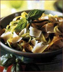 Ingrediente (pentru 4 persoane): 4 dovlecei mici, 400 g taietei, 80 g de cascaval (neras), 2 legaturi de busuioc, 3 catei de usturoi, 100 ml ulei de masline, sare. Mod de preparare: 747d36h Se spala dovleceii, se sterg si se taie fasii subtiri, cam de marimea taieteilor. Jumatate din cascaval se da pe razatoare, cealalta jumatate se taie "aschii". Pentru pesto: se curata usturoiul, se zdrobeste intr-o piulita (mojar) impreuna cu frunzulitele de busuioc (cateva se pastreaza pentru ornat) si cu cascavalul ras si se toarna uleiul putin cate putin, amestecand intruna ca la maioneza. Apoi se tine la frigider pana ce s-au fiert taieteii. Se pune apa cu sare pe foc, se introduc taieteii si se lasa sa fiarba doua minute, din clipa cand incepe apa sa clocoteasca. Se adauga fasiile de dovlecei si se mai lasa inca doua minute. Se scurg taieteii si dovleceii, se pun intr-un castron incalzit si se amesteca usor. Se orneaza cu frunze de busuioc si aschii de cascaval si se servesc cu pesto.