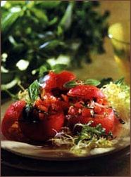 Ingrediente (pentru 6 persoane): 20 rosii mijlocii, 4 cepe de arpagic, 200 ml ulei de masline, 1 legatura de busuioc, zeama de la o lamaie, sare, piper macinat. Mod de preparare: 747d36h Se oparesc rosiile si se cojesc. La 12 dintre ele li se taie capacelul si apoi se scobesc usor cu o lingurita. Se da un praf de sare in interiorul lor si se lasa sa se scurga cu gura in jos, pe hartia absorbanta. Celelalte 8 rosii se taie cubulete, dupa ce s-au indepartat semintele (prin apasare). Se curata ceapa si se toaca marunt, iar frunzulitele de busuioc se taie fasii. Se pun rosiile taiate, ceapa si busuiocul intr-un castron, se toarna peste ele zeama de lamaie si uleiul, se adauga putina sare si se amesteca bine. Cu compozitia astfel preparata se umplu rosiile scobite, se pipereaza si se pun la loc capacelele. Se orneaza cu frunzulite de busuioc si se servesc asa, proaspat pregatite, pe un strat de salata verde.