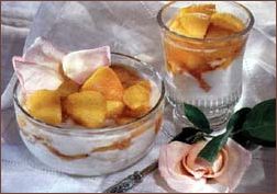 Ingrediente (pentru 6 persoane): 6 piersici mari, 50 g petale de trandafiri (nestropiti cu insecticide), 1 lamaie, 200 g zahar pudra, 750 g iaurt sau branza dulce de vaci. Mod de preparare: 747d36h Cu o seara inainte, culegeti cativa trandafiri din gradina sau cumparati-i de la piata, dar cu specificarea sa nu fie tratati. Smulgeti petalele si taiati-le partea mai albicioasa de la baza, fiindca este amara (cu o foarfeca). Puneti petalele intr-un castron si acoperiti-le cu 500 ml de apa rece. Lasati-le la macerat peste noapte, vreme de 12 ore. In ziua cand preparati compotul, scufundati piersicile 30 de secunde intr-un vas cu apa clocotita, pentru a le curata de pielita mai usor. Scoateti-le samburii si taiati fructele in bucati potrivite. Strecurati cu grija petalele de trandafiri. Puneti-le intr-un saculet de tifon. Varsati maceratul de trandafiri intr-o craticioara. Adaugati zaharul, sucul si coaja rasa de lamaie, apoi petalele de trandafiri, cu saculet cu tot. Puneti totul la fiert 10 minute, pe foc mic. Adaugati piersicile. Lasati-le sa mijoteasca 15 minute. Lasati siropul sa se raceasca, apoi bagati-l la frigider. Inainte de a servi, strecurati siropul. Puneti in cupe iaurtul sau branza moale si dulce de vaci, bucati de piersici, si deasupra - cateva lin-guri de sirop. Serviti preparatul cat mai proaspat.