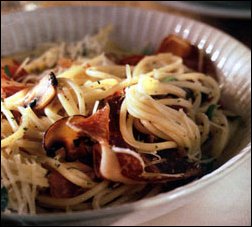 Ingrediente (pentru 4 persoane): 750 g rosii, 250 g ciuperci, 1/2 legatura maghiran, 1 crenguta de cimbru, 1 ceapa, 1 catel de usturoi, 500 g spaghete, sare, 3 linguri ulei de masline, piper proaspat macinat, 100 g carnati afumati (taiati felii subtiri), 60 g cascaval. Mod de preparare: Se oparesc rosiile, se curata de pielita si se taie bucati. Ciupercile curatate se taie felii, ceapa, usturoiul si frunzulitele de cimbru si maghiran se toaca marunt. Se fierb spaghetele (al dente) in apa cu sare si, intre timp, se calesc in uleiul bine incins ceapa si usturoiul, pana ce devin sticloase. Apoi se adauga ciupercile, se prajesc putin, si la urma de tot - rosiile si ierburile care se dunstuiesc si ele 2-3 minute si se gusta de sare si piper. Carnatii se taie felii, spaghetele se scurg si se baga sub un jet de apa rece. Se pun toate intr-un castron, se amesteca bine cu sosul si se presara cu cascavalul ras.