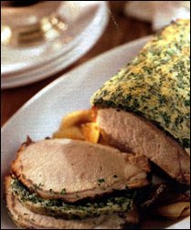Ingrediente (pentru 4-6 persoane): 1,5 kg cotlet de porc (fara os). Pentru marinata - 3 linguri sos de soia, 1 lingura mustar (potrivit de iute), 6 linguri ulei, 2 morcovi, 1 ceapa, 1 cuisoara, 2 fire frunze de telina, 1 lingura bulion, 1/4 l vin rosu, 400 ml supa din concentrat de vita. Pentru crusta - 2 fire salvie, 4 crengute cimbru, 1 legatura patrunjel verde, 100 g cascaval, 1 albus, sare, piper. In plus - 3 linguri ulei pentru prajit. Mod de preparare: Se spala carnea cu apa rece si se zvanta cu un stergar. Se amesteca sosul de soia, mustarul si uleiul si, cu marinata astfel preparata, se unge bine carnea, care se lasa o ora la frigider. Intre timp, se curata morcovii si se taie bucati, se curata ceapa si se infig in ea cuisoare. Se-ncinge uleiul intr-o tava de friptura (nu prea mare) si se prajeste putin carnea pe toate partile. Se adauga morcovii, ceapa, frunzele de telina, bulionul si marinata ramasa, se toarna deasupra vinul si zeama de carne si se baga in cuptorul incins la 225?C. Se lasa friptura sa se patrunda cam o ora si 20 de minute, stropind-o din cand in cand cu sosul din tava. Ierburile spalate si tocate marunt se amesteca cu cascavalul ras, se sareaza, se pipereaza si apoi se incorporeaza albusul batut spuma. Cand e gata friptura, se unge cu amestecul de albus si verdeata, se baga din nou la cuptor si se mai rumeneste 5-8 minute. Apoi se scoate din tava si se lasa 5 minute sa se "odihneasca"; se taie carnea felii si se serveste impreuna cu sosul de friptura trecut prin strecuratoare si gustat de sare si piper.
