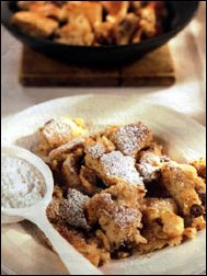 Ingrediente (pentru 2 persoane): 2 oua, 2 linguri zahar pudra, 100 ml lapte, 100 g smantana dulce subtire (sau frisca nebatuta), 75 g faina, 50 g migdale macinate, 20 g zahar tos, 75 g stafide inmuiate in rom, 40 g unt, 1 lingura de zahar farin pentru pudrat. Mod de preparare: Se freaca galbenusurile cu zaharul pudra pana ce devin spumoase, se adauga laptele, smantana, faina si migdalele si se lasa sa creasca (sa se umfle) circa 30 de minute. Se bat albusurile cu zaharul tos si se incorporeaza in aluatul preparat anterior impreuna cu stafidele inmuiate in rom. Intr-o tigaie mare se pune la incins jumatate din unt si se toarna aluatul, care se prajeste ca o omleta pe ambele parti. Cand s-a rumenit putin, se rupe bucati cu ajutorul unei linguri si al unei furculite, apoi se adauga restul de unt si se lasa bucatile sa se coloreze frumos. Se pudreaza cu zahar farin si se servesc direct din tigaie.