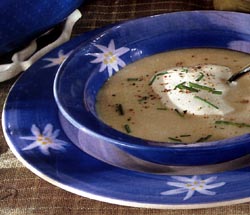 Ingrediente (pentru 4 persoane): 4 cepe mici, 1/2 legatura codite de ceapa verde, 250 ml vin alb sec, 250 ml lapte, 150 g frisca batuta, 100 ml smantana subtire, 1 cub concentrat de pui, 1 cub concentrat de vita, 2 linguri zeamil (sau Maizena), sare, piper. Mod de preparare: - Sarati si piperati frisca batuta, presarati peste ea coditele de ceapa verde taiate rondele si bagati-o la frigider. - Diluati cele doua cuburi de concentrat de carne in 500 ml de apa calda. - Curatati ceapa, tocati-o marunt, puneti-o intr-o oala si turnati deasupra vinul alb. Lasati-o sa fiarba, pana ce lichidul scade la jumatate. - Adaugati zeama de carne si putin piper si lasati supa sa fiarba inca 20 de minute. - Diluati zeamilul in lapte, incorporati-l in supa, impreuna cu smantana, si lasati supa sa se ingroase circa 5 minute, amestecand intruna. Serviti-o calda, garnisita cu frisca batuta si cu paine de vatra.
