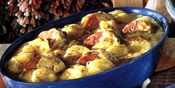 Ingrediente (pentru 4 persoane): - 1 kg cartofi nesfaramiciosi, 1 carnat, 500 ml lapte, 250 ml frisca nebatuta (smantana), 100 g cascaval, 100 g unt, sare, piper. Mod de preparare: - Incingeti cuptorul la 210ĄC. - Curatati cartofii, stergeti-i cu un stergar de bucatarie (fara sa-i spalati) si taiati-i rondele. Puneti-i intr-o tigaie, turnati peste ei laptele si lasati-i sa fiarba 10 minute, la foc mic. - Rasturnati cartofii intr-o forma unsa cu unt, adaugati frisca nebatuta sau smantana, sare si piper si presarati peste ei 80 g de cascaval ras si untul ramas, taiat bucatele. Dati-i la cuptor si lasati-i sa se patrunda 40 de minute. - Intre timp, puneti carnatul intr-o cratita, acoperiti-l cu apa rece si lasati-l sa fiarba incet, 40 de minute. Intepati-l cu o furculita (din loc in loc), lasati-l sa se scurga si taiati-l bucati mai groase. - Asezati bucatile de carnat printre cartofi, presarati deasupra restul de cascaval ras, lasati-i inca 10 minute la cuptor sa se gratineze si serviti-i imediat.