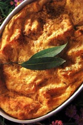 Ingrediente (pentru 4 persoane): 8 felii de paine mai veche (toast), 60 g unt moale, 150 g cascaval ras, 4 oua, 1 ceasca zeama concentrata de pui (Knorr+apa), 1/2 ceasca frisca nebatuta (smantana), piper proaspat macinat. Mod de preparare: - Se incalzeste cuptorul la 150ĄC. Se indeparteaza coaja de paine, se ung cele 8 felii cu unt - pe-o singura parte -, iar peste patru dintre ele se presara cam 2/3 din cascavalul ras. Se lipesc feliile doua cate doua (una cu cascaval cu una fara cascaval) si se taie in doua pe diagonala. - Se unge o forma (nu prea adanca) de budinca cu untul ramas si se aseaza in ea feliile (lipite) de paine. - Se bat ouale cu zeama de carne si cu frisca sau smantana, se toarna peste paine, avand grija sa se inmoaie bine toate bucatile si se lasa sa stea 30 de minute. - Se presara deasupra cascavalul ramas si piperul macinat, se da sufleul la cuptor si se lasa pana ce se intareste si se rumeneste frumos.