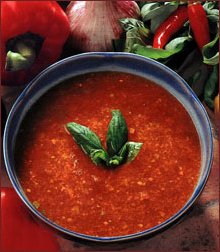 Ingrediente (pentru 4 persoane): 500 g rosii bine coapte, 2 ardei rosii (capia), 6 cepe arpagic, 1 lamaie, 2 catei de usturoi, 2 fire de busuioc, 656f59g 1 fir de cimbru, 1 foaie de dafin, un ardei iute mic, 1 cub de concentrat de supa de pasare, 5 linguri de untdelemn, 1 bucata de zahar cubic, sare, piper, 1/2 bagheta. Mod de preparare: Taiati bagheta felii, apoi in cubulete si rumeniti-le in putin untdelemn. Scoateti-le din tigaie si puneti-le deoparte. - Spalati ardeii, scoateti-le pedunculul si semintele. Taiati-i in ineluse. Curatati si spalati arpagicul. Curatati usturoiul si zdrobiti-l intr-un mojar. - Puneti legumele indicate intr-o oala, varsati deasupra o cana de apa si 2 linguri de untdelemn. Puneti totul la fiert 10 minute, pe foc mic. - Intre timp, spalati rosiile, scoateti-le capacul (codita) si taiati-le in sferturi. Puneti-le in oala, impreuna cu busuiocul, cimbrul, foaia de dafin, cubul de supa zdrobit si bucatica de zahar. Turnati deasupra o jumatate de litru de apa. Gustati de sare (concentratul de supa este deja sarat) si de piper. Lasati sa fiarba 10 minute. - Scoateti din oala foaia de dafin si cimbrul. Treceti supa prin sita sau mixer. Puneti-o iarasi in oala si incalziti-o. Puneti restul de untdelemn si sucul de lamaie. Serviti supa fierbinte, insotita de crutoane si de cateva feliute de ardei iute (in functie de gust).