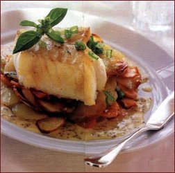 Ingrediente (pentru 6 persoane): 1 kg cartofi rezistenti la fiert (cu coaja roz), sare, piper, 350 ml apa fiarta cu Vegeta sau Delikat, 200 g smantana, 1-2 linguri de mustar, 6 fileuri de cod (salau sau merluciu), sucul unei lamai, 30 g unt, 2 fire de ceapa verde, 1/2 legatura de busuioc. Mod de preparare: - Se spala cartofii, se curata de coaja si se taie in doua, pe lat, apoi in feliute subtiri. Se pun in tava cuptorului, se sareaza, se pipereaza. - Se amesteca mustarul cu smantana si apa fiarta cu Delikat, se toarna peste cartofi si se lasa 25 de minute in cuptorul incins dinainte. - Fileurile de peste se spala, se zvanta si se stropesc cu suc de lamaie. Se sareaza, se pipereaza si se pun peste cartofii din cuptor. Se pun deasupra bucatele de unt si se mai lasa 20 de minute. Cand se serveste, pestele se presara cu ceapa verde taiata ineluse subtiri si busuiocul tocat marunt.