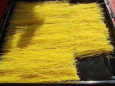 Ungem o tava cu unt topit (eu am facut in tava de la aragaz), apoi asezam fideaua in strat subtire pe toata suprafata tavii.