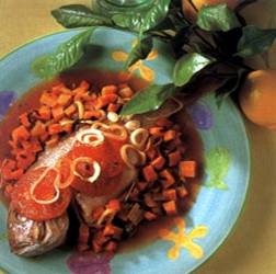 1,5 kg. peste, 1 lamaie, 1 pahar ulei, usturoi, piper, sare, 1/2 kg. rosii (bulion), 3-4 linguri de vin, cimbru 10410q1618k