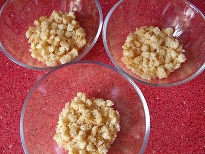 Maruntim 2-3 piscoturi si punem pe fundul bolurilor (paharelor) in care vom