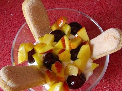 Punem un strat de frisca peste piscoturile maruntite apoi fructe, din nou