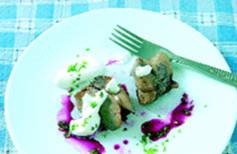 MOD DE PREPARARE: Ficatul se spala in apa calduta, amestecata cu o lingurita de otet de mere, apoi se clateste bine in apa rece. Se portioneaza si se impaneaza cu slanina. Bucatile se trec prin faina, se inabusa in untura si 40 ml apa. Separat se inabusa ceapa taiata marunt, peste care se adauga restul de faina, laptele rece si se amesteca bine. Se continua fierberea si se pune in compozitie si smantana. Sosul format se toarna peste ficatul inabusit. Se adauga vinul, sarea, piperul si usturoiul si se mai fierb cateva minute.