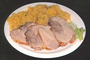 Se aseaza in farfurie friptura cu sosul respectiv, peste care se pune varza calita.