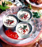 Curatati cepele, tocati-le marunt, puneti-le intr-o tigaie impreuna cu vinul alb si lasati-le sa fiarba si sa scada pana ce nu mai raman decat doua linguri de zeama. Adaugati smantana, luati tigaia de pe foc, incorporati untul - cate-o bucatica -, amestecand cu telul, si turnati compozitia in patru forme mici, rezistente la foc.