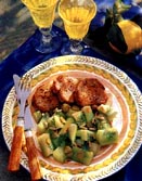 Intr-un castron asezat pe baie de apa, bateti galbenusurile cu zeama de lamaie pana ce devin cremoase. Sarati, piperati, adaugati cascavalul ras si jumatate din coditele de ceapa taiate marunt si turnati amestecul astfel preparat peste castraveti.