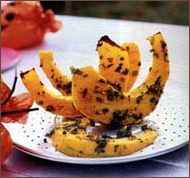 Ingrediente (pentru 4 portii): 1 bucata mai mare de dovleac curatat de coaja si seminte (circa 1 kg), 50 g unt topit, sare, piper pisat, 1/2 legatura patrunjel verde, 1 catel de usturoi. Mod de preparare: Se taie dovleacul felii groase de 1-2 cm, care se pun intr-o tigaie de teflon in untul bine incins si se rumenesc circa 5 minute pe fiecare parte. Se sareaza, se pipereaza, se presara cu patrunjelul tocat si usturoiul presat si se mai lasa putin pe foc. Dovleacul astfel preparat se poate servi cu smantana si verdeata - ca aperitiv - sau ca garnitura la orice fel de friptura.