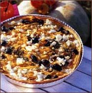 Ingrediente (pentru 6 portii) - Aluatul: 150 g faina, 1/2 plic praf de copt, 75 g branza de vaci slaba, 3 linguri ulei de masline, 3 linguri lapte, sare, grasime pentru uns forma. Umplutura: 500 g miez de dovleac, 1 gogosar copt curatat si taiat fasii, 2-3 linguri ulei, 2 catei de usturoi, 1 ceapa, 1 ardei iute (rosu), piper proaspat macinat. Glazura: 3 oua, 150 g smantana dulce (subtire), 2 linguri verdeata tocata (salvie, rozmarin, cimbru), 150 g branza telemea, 50 g masline negre fara samburi (sau bacon). Mod de preparare: Aluatul - Se framanta un aluat din ingredientele indicate, se intinde si se asaza intr-o forma unsa (diametrul 30 cm), acoperind si marginile (circa 2 cm). Umplutura: Se taie miezul de dovleac fasii (stifturi), se pune uleiul sa se-ncinga si se calesc - circa 3 minute - usturoiul tocat marunt, ceapa si ardeiul iute taiate feliute si fasiile de gogosar copt. Apoi se adauga stifturile de dovleac si se lasa sa mijoteasca inca 5 minute. Se sareaza, se pipereaza, se lasa putin sa se raceasca si se toarna peste aluatul din forma. Peste ele vine glazura, adica ouale batute bine cu smantana si verdeturile tocate. Deasupra se presara telemeaua faramitata si masline (sau fasii de bacon), se baga tarta in cuptorul incins la 200?C si se lasa sa se coaca circa 30 de minute. Se poate servi fierbinte sau rece.