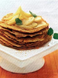 Ingrediente (pentru 4 persoane): 1,5 kg mere acrisoare, 2 linguri zeama de lamaie, 3 linguri zahar, 500 g morcovi, 8 oua, 1/4 l lapte, 250 g faina, sare, 2 plicuri zahar vanilat, 60 g unt topit. Mod de preparare: - Se curata merele, se taie in patru, se indeparteaza semintele si partea lemnoasa, se taie din nou in spalturi si se stropesc cu zeama de lamaie. Se pune zaharul intr-o cratita, se caramelizeaza, se adauga 100 ml de apa si merele taiate si se dunstuiesc circa 5 minute la foc mic, dupa care se lasa sa se raceasca. - Morcovii spalati si curatati se dau pe razatoarea mica. Se amesteca ouale, laptele, faina, sarea si zaharul vanilat si se incorporeaza morcovii rasi. - Din aluatul astfel preparat se fac circa 16 clatite mai mici si se prajesc in untul incins. (Pe masura ce s-au prajit, se tin la cald, pana se termina aluatul.) Clatitele se servesc cu compot de mere, presarate - eventual - cu putin zahar amestecat cu scortisoara pisata.
