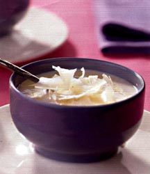 Ingrediente (pentru 4 persoane): 1 conopida, 1 cartof mare, 1 l lapte, 1 catel de usturoi, 20 g unt, 1/2 lingurita nucsoara rasa, 50 g parmezan, ulei de masline, sare, piper. Mod de preparare: - Spalati conopida si rupeti-o bucatele. Curatati cartoful, spalati-l si taiati-l cubulete. Zdrobiti sau presati usturoiul curatat. - Turnati laptele intr-o oala si puneti in el buchetelele de conopida, cubuletele de cartofi si usturoiul zdrobit. Adaugati sare si piper si lasati supa pe foc pana ce da in clocot. Faceti focul mai mic si lasati-o sa fiarba 20 de minu 18518p1511s te, acoperind oala doar pe jumatate. - Varsati supa in robotul de bucatarie si mixati-o, pana ce obtineti o compozitie cremoasa. Incorporati untul si nucsoara si mai gustati-o o data de sare si piper. - Cand serviti supa-crema, garnisiti-o cu felii subtiri de parmezan si turnati peste ea un firicel de ulei de masline - fara sa amestecati -, ca sa fie mai colorata si mai onctuoasa.