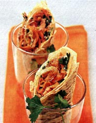 Ingrediente (pentru 4 persoane): 250 g morcovi, 1/2 legatura patrunjel verde, 6 linguri sos iute (de chili), 200 g smantana, 2 conserve de ton in ulei (scurs: 300 g), 8 bucati aluat de pizza (coapte), 1 lingura mirodenii (amestecate). Mod de preparare: - Se spala morcovii, se curata si se dau pe razatoarea mare. Patrunjelul spalat si zvantat se toaca marunt si se amesteca cu smantana si sosul iute. Tonul se scurge si se rupe bucatele cu o furculita. - Se pun cele 8 bucati de aluat copt pe planseta si se ung, una cate una, cu amestecul de smantana. Se presara apoi mirodeniile, morcovii rasi si bucatelele de ton, lasandu-se marginile libere. - Se indoaie putin marginile laterale ale aluatului si se ruleaza, cat mai strans, de jos in sus. Se servesc asa, pur si simplu, sau se infasoara in servetele.
