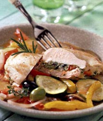 Ingrediente (pentru 4 persoane): 4 piepti de pui, 24 masline verzi si negre (fara samburi), 2 catei de usturoi, 1 rosie, 250 g paine veche, 2 linguri patrunjel verde, o lingura ulei de masline, 15 g unt, sare, piper. Pentru ghiveci: 500 g rosii, 1 vanata, 2 dovlecei mici, 1 ardei gras rosu, 1 ardei gras galben, 1 ceapa, 1 catel de usturoi, 125 ml ulei de masline, 4 linguri vin alb, 1 crenguta de cimbru, 1 crenguta de rozmarin, sare, piper. Mod de preparare - Ghiveciul: - Spalati vanata, taiati-o rondele, presarati deasupra putina sare si lasati-o 20 de minute sa zemuiasca. - Curatati rosiile de pielita si taiati-le in patru. Taiati dovleceii rondele, iar ceapa curatata, fideluta. Curatati usturoiul si presati-l. Spalati ardeii, curatati-i de seminte si nervuri si taiati-i fasii. - Zvantati rondelele de vanata si prajiti pe rand toate legumele (inclusiv ceapa si usturoiul) cate 2-3 minute. - Puneti-le intr-o cratita, adaugati cimbrul, rozmarinul, sarea, piperul, vinul si un firicel de ulei si lasati-le sa fiarba incet, fara capac, circa 30 de minute. Puiul umplut: - Incingeti cuptorul la 200ĄC. Tocati maslinele si usturoiul, taiati rosia cubulete si sfaramati painea uscata. Amestecati maslinele, usturoiul, rosia, painea si patrunjelul verde tocat, sarati si piperati. - Despicati fiecare bucata de piept de pui pe lung si puneti in despicatura (fanta) umplutura preparata anterior. Prajiti-le intr-o tigaie, in uleiul amestecat cu unt, si dupa ce s-au rumenit circa 3 minute pe fiecare parte, dati-le la cuptor si lasati-le sa se patrunda 20 de minute.