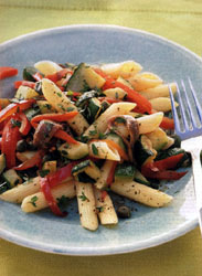 Ingrediente (pentru 4 persoane): 160 g macaroane, sare, 2 dovlecei, 2 ardei grasi, 2 cepe, 2 catei de usturoi, 2 lingurite ulei, piper, 10 linguri concentrat de legume (Delikat+apa), 1 lingura cimbru maruntit, 4 fileuri de sardele (din conserva), 2 lingurite capere. Mod de preparare: Se fierb macaroanele al dent 545d318f e in apa cu sare si se lasa sa se scurga. Dovleceii si ardeii grasi se spala si se taie bucatele, iar ceapa si usturoiul - curatate si spalate - se toaca marunt. Se unge cu ulei o tigaie de teflon si se calesc legumele pregatite. Se sareaza, se pipereaza, se adauga zeama de zarzavat si se lasa 5 minute sa se dunstuiasca. Se incorporeaza cimbrul, sardelele, caperele si macaroanele scurse, se amesteca si se mai gusta o data de sare si piper.