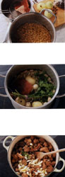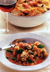 Ingrediente (pentru 6 persoane): 500 g fasole alba (uscata), 5 cepe, 6 cuisoare, 100 g sorici, 3 crengute cimbru, 3 fire patrunjel, 2 foi de dafin, 6 catei de usturoi, 250 g carnati (usturoiati), 500 g carne de miel, 400 g ceafa de porc, 100 g costita, 4 linguri untura, sare, piper, 3 rosii mari (circa 500 g), 2-3 linguri pesmet. Mod de preparare: 1. Se pune fasolea la inmuiat. Se pune fasolea intr-o oala mare, se adauga 2 l de apa si se lasa peste noapte - cu capac - sa se inmoaie. Se curata 3 cepe si se infig in ele cuisoarele. Soriciul se pune in apa clocotita si se lasa sa fiarba cateva minute. 2. Se fierbe fasolea. Se leaga cu o ata patrunjelul, cimbrul si o foaie de dafin. Se fierbe fasolea circa o ora in apa in care a fost inmuiata, impreuna cu cele 3 cepe impanate, soriciul, buchetul de ierburi aromate si 3 catei de usturoi curatati de coaja. Se adauga carnatul si se fierbe si el impreuna cu fasolea, circa 1/2 ora. 3. Se prajeste carnea de miel si de porc. Carnea spalata si zvantata se taie bucati potrivite, iar costita se taie cubulete. Se prajesc toate in untura incinsa, se toaca marunt celelalte 2 cepe si cei 3 catei de usturoi, se prajesc si ele cateva minute impreuna cu carnea, dupa care se adauga si foaia de dafin ramasa. 4. Se fierbe carnea. Se scurge fasolea, iar zeama de toarna peste carne. Se adauga rosiile curatate de pielita si taiate marunt si se fierb incet, impreuna cu carnea la foc mic, aproximativ o ora. 5. Se pun ingredientele intr-o forma rezistenta la foc. Pe fundul formei se aseaza soriciul, iar peste el se toarna jumatate din fasole. Peste fasole urmeaza bucatile de carne si deasupra restul de fasole, in care s-a incorporat carnatul taiat felii. 6. Cassoulet-ul se rumeneste la cuptor. Peste amestecul de fasole si carne se presara pesmetul, se baga la cuptorul incins la 200ĄC si se lasa sa se rumeneasca circa 30 de minute.