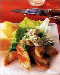 Ingrediente (pentru 4 portii): 2 oua, 600 g piept de pui (4 fileuri), sare, piper, 2 linguri faina, 1 lingura ulei, 2 castraveciori murati (100 g), 150 g smantana, 2 pahare iaurt (a 150 g), piper. Mod de preparare: - Se fierb ouale tari (circa 10 minute), se baga sub un jet de apa rece, se curata de coaja si se lasa la racit. - Se spala fileurile, se zvanta intr-un stergar si se taie fasii late de circa 1 cm. Se sareaza, se pipereaza, se dau prin faina si se prajesc aproximativ 5 minute in uleiul incins. - Se taie ouale marunt, castraveciorii - cubulete, se amesteca cu smantana si iaurtul si se gusta de sare si piper. Sosul astfel preparat se serveste cu fileurile prajite, care se pot presara dupa gust cu marar verde tocat. Garnitura ideala: cartofii fierti.