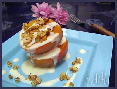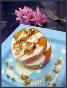 Puneti piersicile pe o farfurie, turnati iaurt deasupra si apoi