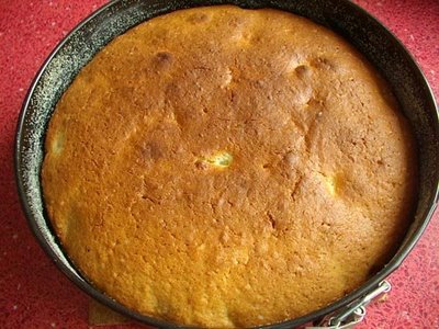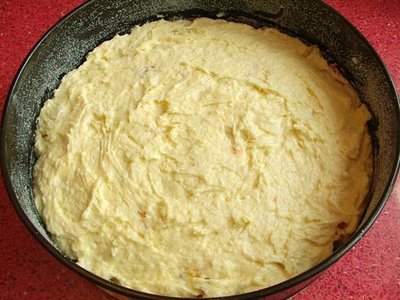 Aluatul il turnam in forma unsa si tapetata si nivelam putin (reteta originala era in forma de guguluf, dar eu nu am avut).