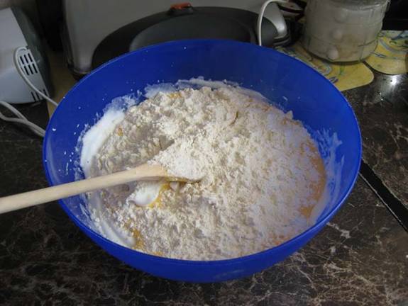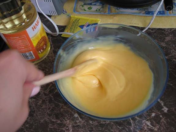 maioneza. Aceasta compozitie se pune peste albusuri. Apoi se pune faina si se amesteca cu lingura de