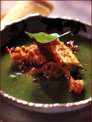 17417n137r Ingrediente (pentru 4 persoane): 1 kg mazare verde proaspata, 2 cepe albe, 2 cartofi, 20 g unt, 1 lingura zahar, 10 frunze de busuioc, 100 ml smantana, 8 felii subtiri de slanina (costita) afumata, 1 lingura ulei, sare, piper. 17417n137r Mod de preparare: Se alege mazarea, se curata cartofii si ceapa si se taie cubulete. Se-ncinge uleiul intr-o cratita si se lasa legumele sa se caleasca, amestecand intruna. Se adauga zaharul, busuiocul si 1 l de apa, se sareaza si se fierb foarte incet - cu capac - circa 15 minute. Cand sunt gata fierte, se rastoarna in robotul de bucatarie si se mixeaza, adaugand smantana. Se prajesc feliile de slanina intr-o tigaie unsa cu ulei, se intorc pe ambele parti si, cand s-au rumenit frumos si sunt crocante, se scot din tigaie si se lasa sa se scurga pe hartie absorbanta. Se toarna mazarea in cupe sau boluri, se pun la mijloc feliile de slanina, se presara de jur-imprejur piperul macinat si se serveste imediat. Slanina afumata poate fi inlocuita cu costita, bacon sau jambon (taiate lamele subtiri si prajite).