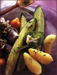 17417n137r 17417n137r Ingrediente (pentru 4 persoane): 4 castraveti mici (intre 14-25 cm), 250 g rosii mici, 12 cartofi noi marunti, 8 rulouri de scrumbie marinata, 8 linguri maioneza cu lamaie, seminte de susan, sare, piper. 17417n137r 17417n137r Mod de preparare: Se curata cartofii noi si se fierb 10 minute in aburi. Se spala castravetii, se curata de coaja si se taie in patru pe lung. Rosiile se spala si se taie in doua sau in patru. Se aseaza in fiecare farfurie castravetii, rulourile de peste, cartofii si rosiile, se toarna peste ele cate 2 linguri de maioneza acrita cu lamaie, se sareaza, se pipereaza, se presara cu semintele de susan si se servesc imediat.