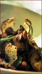17417n137r 17417n137r Ingrediente (pentru 6 persoane): 1,2 kg copane de pui, 3 vinete potrivite, 150 g stafide, 3 catei de usturoi, 1/2 legatura cu patrunjel, 1/2 legatura de coriandru, 250 ml untdelemn, 150 ml vin alb sec, sare, piper proaspat macinat. 17417n137r 17417n137r Mod de preparare: - Spalati si stergeti vinetele cu un prosop de bucatarie. indepartati-le coditele, apoi taiati-le in felii de 2 cm grosime, si pe urma fiecare felie in cubulete. Caliti-le intr-o cratita, pe flacara mijlocie, in putin untdelemn bine incins. Adaugati cate putin ulei, pe masura ce este absorbit de vinete. Cand se inmoaie, scoateti-le cu o lingura de spumuit supa si asezati-le pe o hartie absorbanta. - Prajiti copanele de pui in putin untdelemn. Cand sunt rumenite, adaugati vinetele stoarse de ulei si stafidele. Sarati, piperati, turnati vinul alb. Acoperiti vasul si lasati sa mijoteasca 40 de minute. Cu cinci minute inainte ca mancarea sa fie gata, adaugati usturoiul, patrunjelul si coriandrul tocate marunt. Amestecati si serviti mancarica imediat.