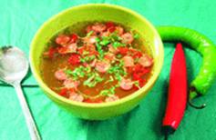 MOD DE PREPARARE: Se curata cartofii, se spala, se taie in cubulete si se pun la fiert in apa clocotita cu sare. Ceapa si usturoiul se curata si se toaca marunt, iar ardeii se curata, se spala si se taie in fasiute. Se infierbanta uleiul si se pun la inabusit ceapa, usturoiul si ardeii. Se adauga boia, se stinge cu doua cani de supa de carne si se fierbe un sfert de ora, dupa care se adauga cartofii. Se sareaza, se pipereaza si se continua fierberea inca 10 minute. Carnatii se taie in rondele subtiri si se adauga in supa, lasand sa fiarba impreuna vreo 5 minute.