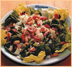2. Puneti frunzele de salata verde intr-un bol. Adaugati cascavalul, baconul,