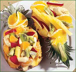 Ornati cu frisca. Puteti servi in cupa sau in jumatate de ananas scobit.