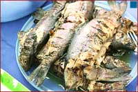 CRAP LA GRATAR Ingrediente: un crap mare (de aproximativ 2,5 kg), o bucata de slanina, o capatana de usturoi, sare, vin. Preparare: Se curata crapul, se spala, se portioneaza, se sareaza si se lasa 10 minute pentru a-l patrunde sarea. Gratarul incins se unge cu slanina, dupa care se asaza pe el bucatile de peste. In timpul prajirii se stropeste cu vin. Se consuma cu mujdei.
