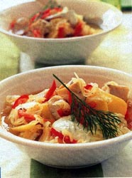 fierbinte. Se adauga cartofii si varza taiata fideluta. Se gusta de sare si de