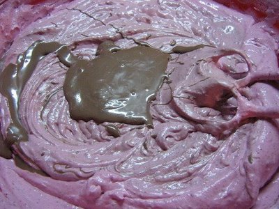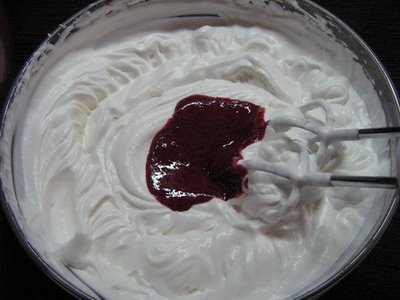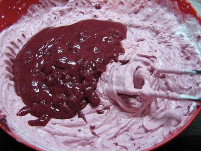 amesteca bine apoi se toarna peste fructele de padure. Frisca se bate, si se adauga fructele mai bine zis piure-ul de fructe.