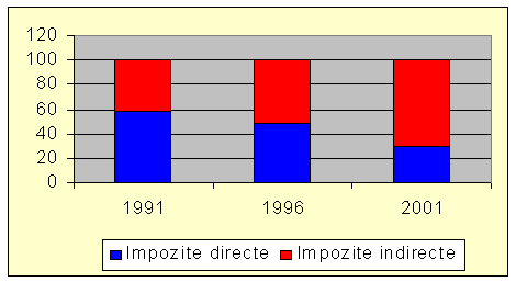 Daca în perioada 1990-1995 impozitele directe aveau un aport mai mare la formarea veniturilor bugetului general cosolidat comparativ cu impozitele indirecte, începând cu anul 1996 raportul dintre cele doua categorii de impozite se inverseaza, accentul fiind pus pe cresterea încasarilor din impozitele indirecte la formarea resurselor publice . Astfel, daca în anul 1992, impozitele directe aveau o pondere de 57,9% din totalul veniturilor bugetare, începând cu anul 1998 ponderea acestora în formarea veniturilor nu a mai depasit niciodata 34%, iar în anul 2000 a ajuns chiar la 26%. În anul 2001 s-a înregistrat o usoara crestere, reprezentând 27,8% din totalul veniturilor bugetare.