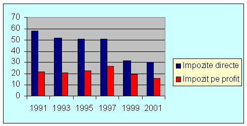Impozitele directe reprezentau 58% în anul 1991, iar în anul urmator au urcat la 61%, pondere pe care nu o vor mai atinge niciodata în tot intervalul analizat. În intervalul 1993-1997, ponderea impozitelor directe în totalul veniturilor fisacale s-a situat între 49 si 55%, iar în anul 2000 ponderea acestora a fost de doar 27,5%, urmând ca în anul 2001 s-a crasca putin, având o cota de 30% din totalul veniturilor fiscale. Pentru o împartire mai echitabila a impozitelor pe fiecare contribuabil, proportia impozitelor directe ar trebui sa creasca în viitor.