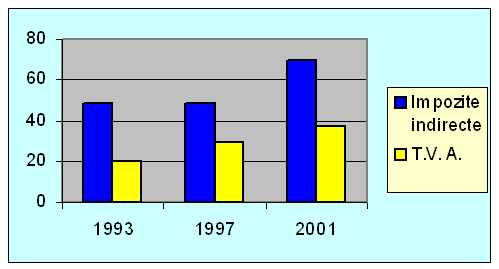 Impozitele indirecte, pe de alta parte, aveau în anul 1992 un cuantum de 36,8% din totalul veniturilor, în anul urmator crescând cu zece procente. Anul 1998 situeaza impozitele indirecte la o cota de 56,5% din totalul veniturilor bugetare, iar ponderea a crescut si în anii urmatori, ajungând în anul 2000 la 68,9%, în anul 2001 înregistrându-se o usoara scadere de 5,0 puncte procentuale.