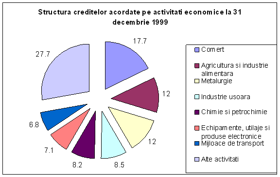Dupa cum se observa, cea mai mare beneficiara de credite a fost industria cu 67,3% din total, urmata in ordine de comert (16,0%), agricultura si transporturi (2,6%), constructii (1,7%). In cadrul industriei, care a avut permanent o pondere semnificativa in volumul total al creditelor acordate pentru finantarea economiei reale, sectoarele prioritare au fost metalurgia, industria chimica si a fibrelor sintetice, industria alimentara, a tutunului si a bauturilor, industria mijloacelor de transport si altele.