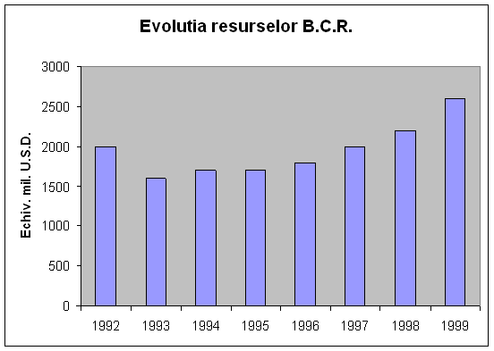 Incepand din anul 1993 si pana in prezent, odata cu dezvoltarea pietei financiar-bancare interne si a introducerii unor reglementari specifice acesteia, evolutia ascendenta a resurselor B.C.R., an de an, este indiscu-tabila. Din punct de vedere al structurii resurselor atrase de banca, in echivalent U.S.D., se remarca de asemenea o evolutie pozitiva prin consolidarea ponderii detinute de resursele atrase de la persoane fizice si juridice, concomitent cu diminuarea treptata a dependentei B.C.R. de resursele la costuri ridicate precum refinantarea B.N.R. pe termen scurt, resurse ce nu constituiau o baza ideala pentru procesul de sustinere a economiei nationale prin acordarea de credite pe termen mediu si lung.