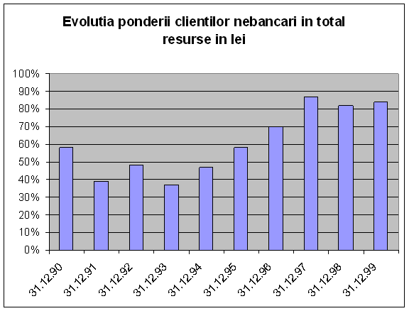 Evolutia ascendenta a resurselor in lei atrase de la clienti nebancari a condus la majorarea ponderii detinute in total resurse in lei de la 57,9% la 31 decembrie 1990 la 84,1% la 31 decembrie 1999. Evolutia ponderii in totalul resurselor in lei atrase de B.C.R. de la clienti nebancari in perioada 31 decembrie 1990 - 31 decembrie 1999 se prezinta in graficul urmator: